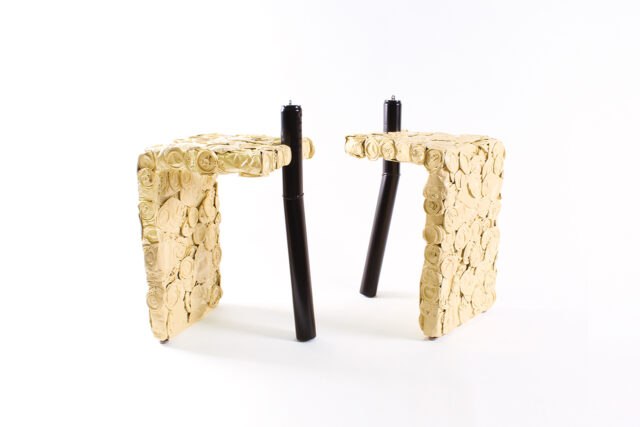 Umasi Table XXI (subtitled “Have Another?”) mdf, steel, recycled aluminum 15" X 18" X 28" h 2020 $5,000 pair Inquire about this item Post navigation Purple and White Circles Yellow Circles